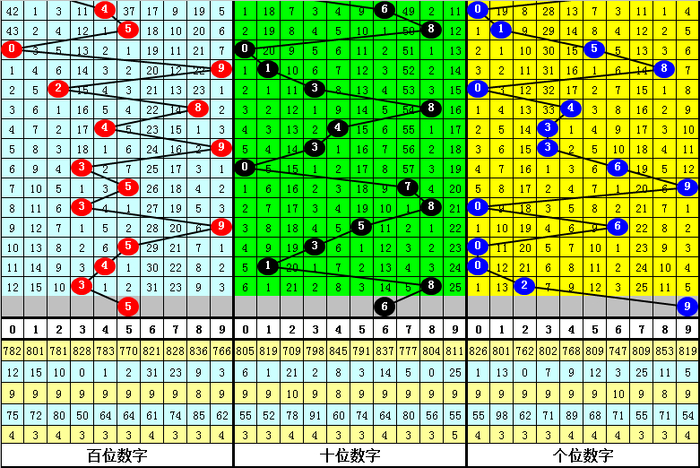 百位分析:上期百位开出奖号:3,最近9期该位奖号大小比为4:5,其中大号5、9出现2次,6、7、8出现0次,小 号3出现3次,4出现2次,0、1、2出现0次,本期百位参考大号,胆码关注5。