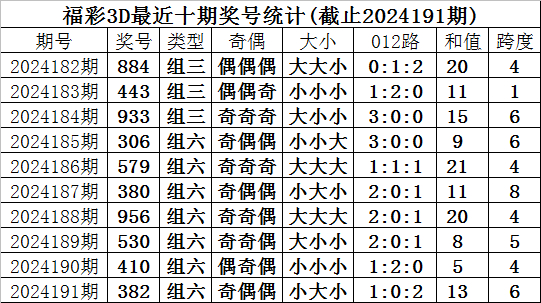 开奖回顾:福彩3D第2024191期奖号为382,奖号形态为:组六、小大小、1:0:2、奇偶偶。