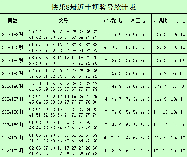 福彩快乐8第2024191期开奖回顾:02 03 07 10 11 13 23 26 28 36 41 46 55 57 62 66 68 69 70 73,其中奖号012路比为5:8:7,四区比为6:4:4:6,奇偶比为10:10,大小比为10:10。