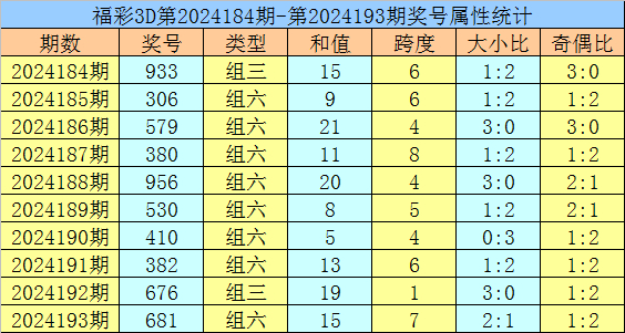 开奖回顾:福彩3D第2024193期开出奖号681。奖号形态为组六,奇偶比为1:2,012路比为1:1:1,大小比为2:1,和值为15,跨度为7。