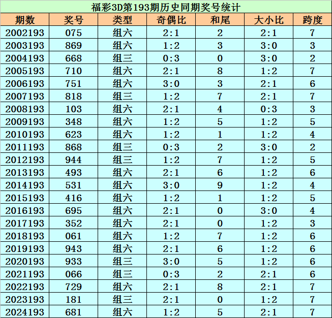 福彩3D历年第193期同期奖号为:075 869 668 710 751 818 103 348 623 868 944 493 531 416 695 352 061 943 933 066 729 181 681。