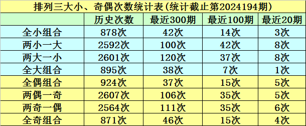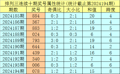 上期回顾:排列三第2024194期奖号:078。类型:组六,奇偶形态:偶奇偶,大小形态:小大大,和值:15,跨度:8。