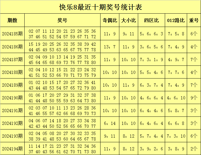 福彩快乐8第2024194期开奖回顾:11 14 17 21 23 27 31 32 34 36 37 40 43 56 61 62 70 71 73 80,其中奖号奇偶比为11:9,大小比为8:12,四区比为3:9:2:6,012路比为3:8:9,重号2个:27、32。