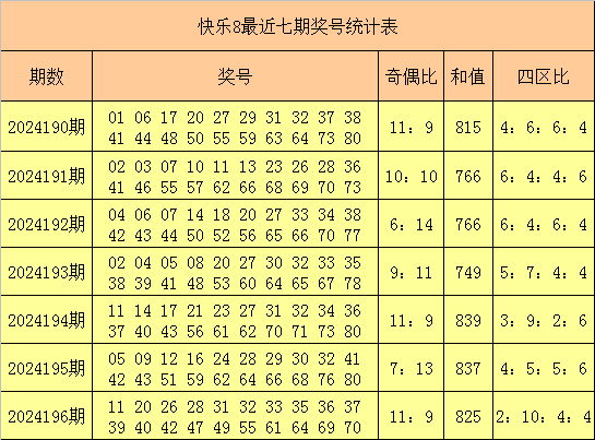 福彩快乐8第2024196期开出奖号:11 20 26 28 31 32 33 35 36 37 39 40 42 47 49 55 61 64 69 70,其中奖号奇偶比为11:9,和值为825,四区比为2:10:4:4。