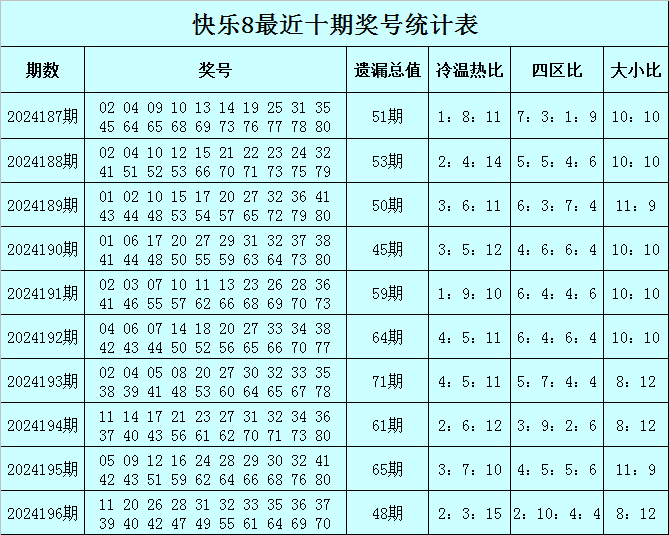 福彩快乐8第2024196期开奖回顾:11 20 26 28 31 32 33 35 36 37 39 40 42 47 49 55 61 64 69 70,其中奖号遗漏总值为48,冷温热码比为2:3:15,四区比为2:10:4:4。