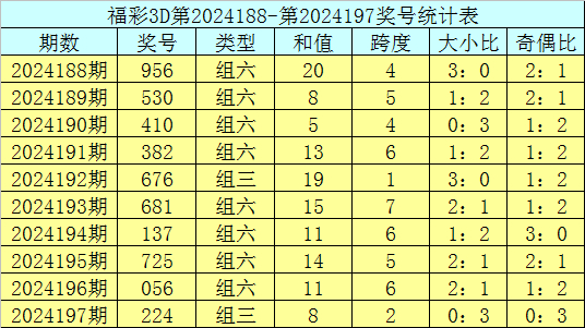 类型判断:上期奖号为224。号码2近10期出现4次,走冷,号码出现频次较低,上期各位号码走势较温,本期关注低频冷码开出。