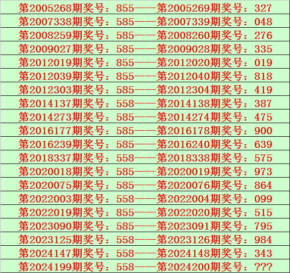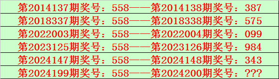 排列三第2024199期开出奖号558,该号码直选类型历史上出现了6次,前5次开出之后期下期奖号为:387、575、099、984、343,见下表: