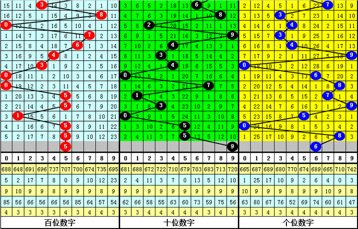 目前百位最冷号码为9,当前遗漏23期,该号码历史最大遗漏为54期,本期百位号码9没有解冻的迹象,继续放弃。