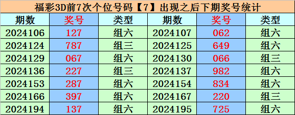 个位分析:上期个位开出奖号7,个位历史上号码7已开出811次,最近100期个位号码开出7次,上期号码遗漏4期出现。