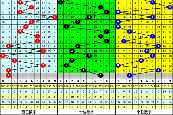 百位分析:百位上期开出号码1,历史上该位号码1出现了803次,最近100期号码1出现次,上期间隔4期再次出现。