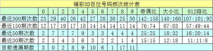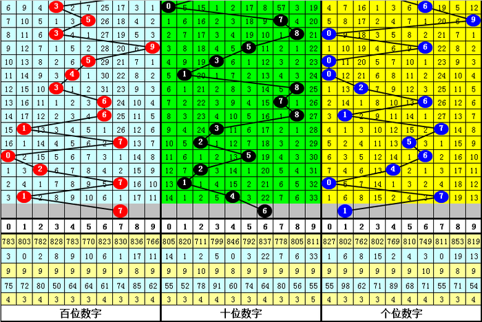 百位分析:最近50期表现较热的号码有:4出现9次,1、2、3出现7次;表现较冷的号码有:0出现2次,5、6出现3次。出号奇偶比为25:25,012路比为16:20:14。本期该位绝杀两码5、6,参考号码0、2、7,精选一码7。
