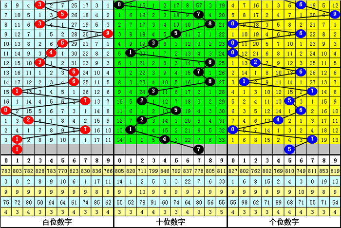 在历史同期号码中,组选0-9号码出现次数为:0、1、4、9出现4次,号码8出现6次,号码2、7出现7次,号码6出现8次,号码5出现10次,号码3出现12次,本期看好两码1、7出现。