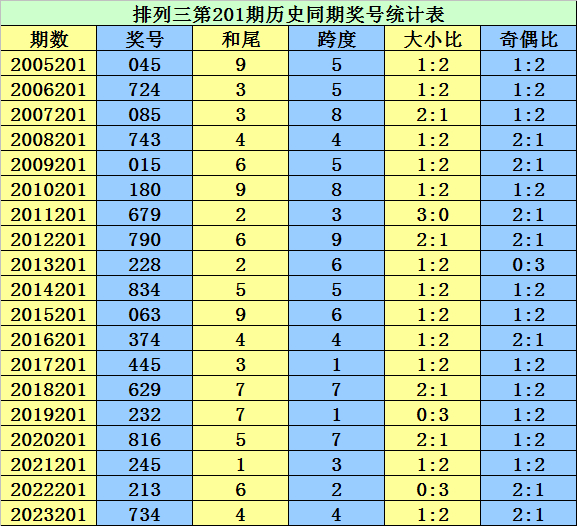 历年第201期排列三同期奖号开出:045、724、085、743、015、180、679、790、228、834、063、374、445、629、232、816、245、213、734。