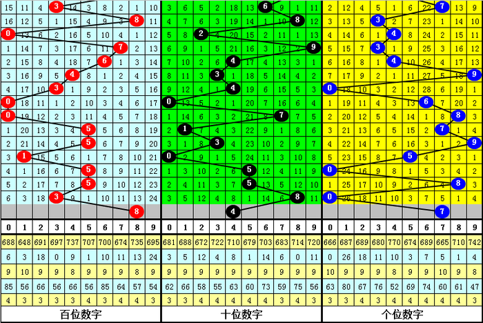 跨度分析:在排列三第201期历史同期中,奖号跨度012路比为5:7:7,奇偶比为11:8,大小比为11:8,跨度出现期数为:跨度5→4期,跨度4→3期,跨度1、3、6、7、8→2期,跨度2、9→1期,跨度0→0期,本期预计开出1路跨度,精选跨度4。