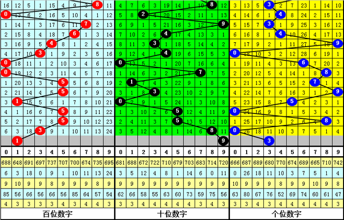 另外组选分布中,号码大小比为10:5,大号表现活跃;号码奇偶比为12:3,偶数号码开出比例较低;号码012路为4:3:8,2路号码相对活跃。且每期奖号都与最近5期奖号有相同的号码。(统计见下表)