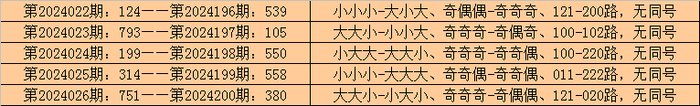 在排列三历史开奖中,第2024022期-第2024026期连续5期奖号为:124-793-199-314-751。