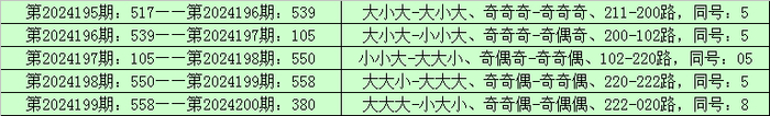 统计排列三已开出的奖号发现,在连续5期(第2024195期-第2024199)奖号为:517-539-105-550-558。