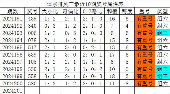 体彩排列三最近10期分别开出奖号:439、340、006、078、517、539、105、550、558、380,各奖号属性详见下表: