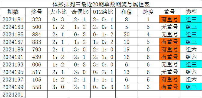 体彩排列三最近20期单数期奖号分别为:323、500、884、883、793、439、006、517、105、558,各期奖号详细属性下表: