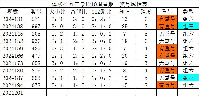 体彩排列三最近10周星期一奖号分别为:571、997、205、936、430、479、658、215、883、078,各奖号属性详见下表:
