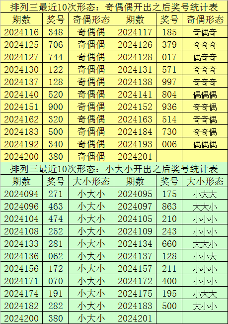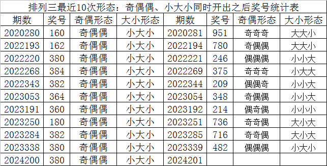 排列三最近10次同时开出奇偶形态:奇偶偶和大小形态:小大小时其奖号分别为:160-162-380-384-382-364-360-180-382-380-380,下期分别开出号码为:951-780-246-375-209-348-214-736-716-482,详细统计见下表: