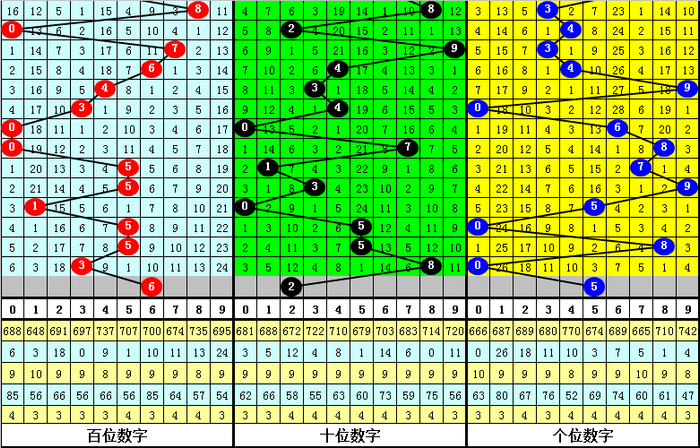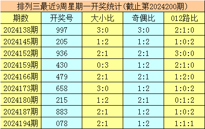 三、体彩排列三前9周星期一奖号分别开出:997-205-936-430-479-658-215-883-078,其中号码012路比为12:6:9,奇偶比为14:13,大小比为16:11;