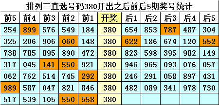 四、排列三直选号码380历史上开出7次,其前后五期奖号分别为: