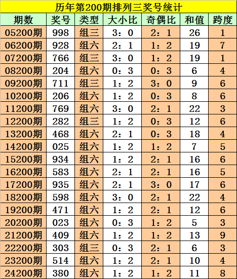 排列三第2024200期奖号:380,和值11,跨度8,大小比1:2,奇偶比1:2。