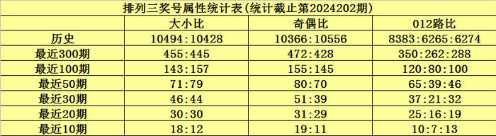 上期回顾:排列三第2024202期奖号为187,奖号012路比为0:2:1,奇偶比为2:1,大小比为2:1,和值为16,跨度为7。