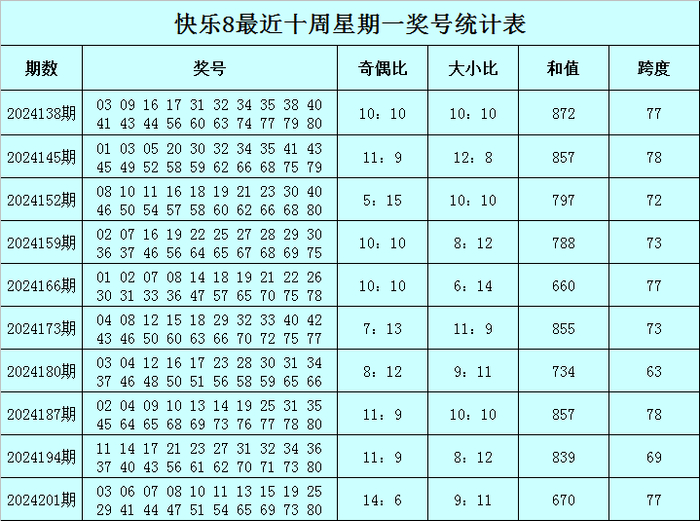 福彩快乐8第2024201期(上周一)开奖回顾:03 06 07 08 10 11 13 15 19 25 29 41 44 47 51 54 65 69 73 80,其中奖号和值为670,跨度为77,奇偶比为14:6,大小比为9:11。