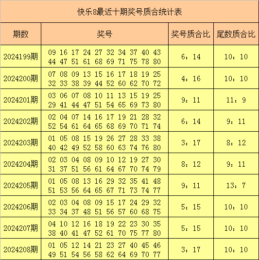 福彩快乐8第2024208期开出奖号:01 05 12 14 21 23 27 40 45 46 49 51 54 56 58 62 64 69 70 77,其中奖号质合比为3:17,奖号尾数质合比为10:10。