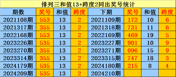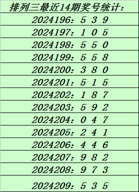 上期回顾:排列三第2024209期奖号:535。和值13,跨度2。
