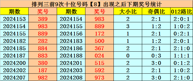 十位号码:十位上期开出奇数、大号、2路号码:8,历史上十位号码8共开出717期,上一次出现在第2024207期,上期奖号遗漏值为2期。