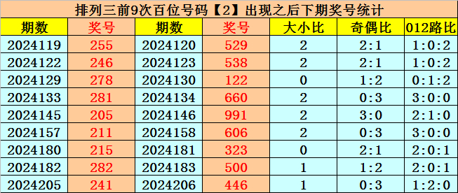 百位号码:百位上期奖号为2路、奇数、大号:2,历史上百位号码2共开出693期,前一次开出期数在第2024205期,上期奖号隔4期再次开出。