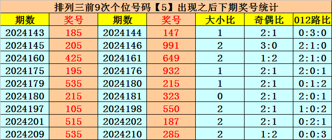 个位号码:上期奖号为大号、奇数、2路号码:5,历史上个位号码5共开出677期,前一次出现在第2024209期,上期奖号为重号。