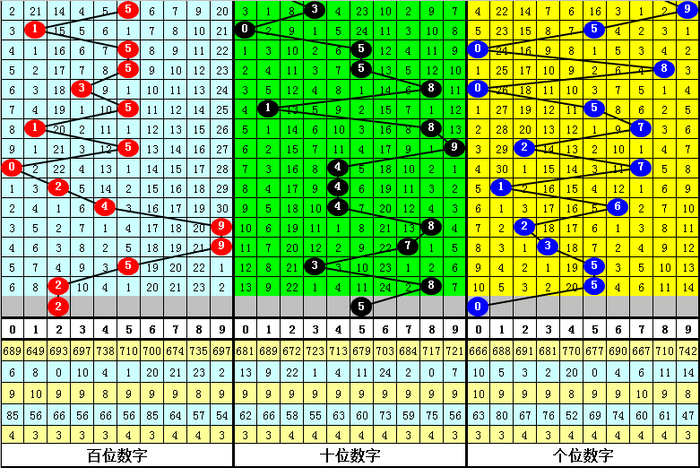 在百位前9次出现号码2之后,下期百位分别开出奖号:5-5-1-6-9-6-3-5-4,其中开出号码个数奇偶比是6:3,大小比是6:3,012路比是4:2:3。