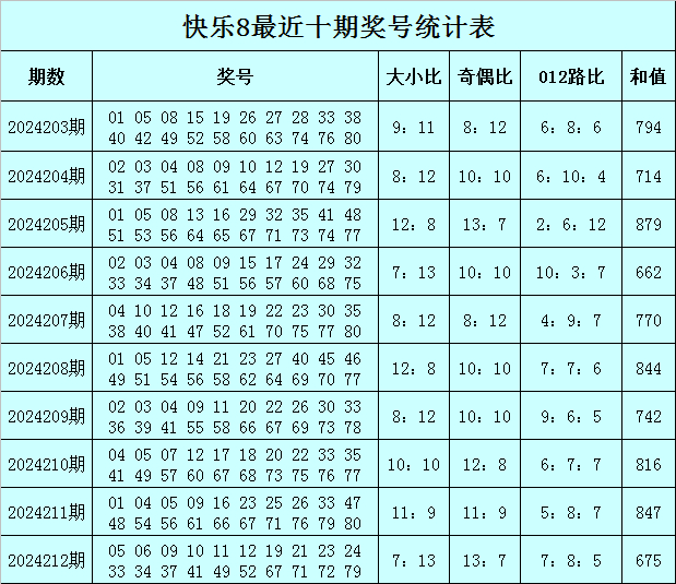 福彩快乐8第2024212期开奖回顾:05 06 09 10 11 12 19 21 23 24 33 34 37 41 49 52 67 71 72 79,其中奖号奇偶比开出13:7,大小比开出7:13,012路比开出7:8:5,和值为675,跨度为74。