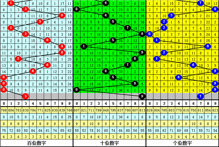 百位上期出现:热号0,该位连续十期以热号出现较多,以冷号出现较少,本期该位温号有5个:1、3、5、7、8,看好温号转热,关注号码3。