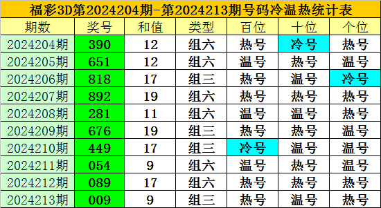 上期回顾:福彩3D第2024213期开奖奖号为:009,奖号类型为:组三,奖号冷温热态为:热号+温号+热号。